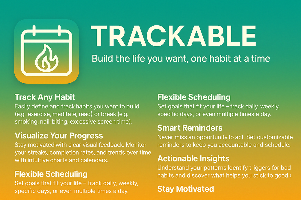 Trackable helps you build positive habits, break unhealthy ones, and achieve your personal goals through consistent daily action. With a clean, intuitive interface and powerful tracking tools, you'll stay motivated and see your progress unfold day by day.